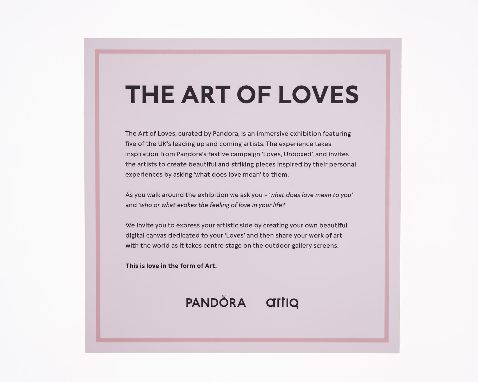 'The Art of Loves' pop-up transforms into an immersive exhibition featuring five of the UK's leading up and coming artists. The experience takes inspiration from Pandora's festive campaign 'Loves, Unboxed', and invites the artists to create beautiful and striking pieces inspired by their personal experiences by asking 'what does love mean' to them.
